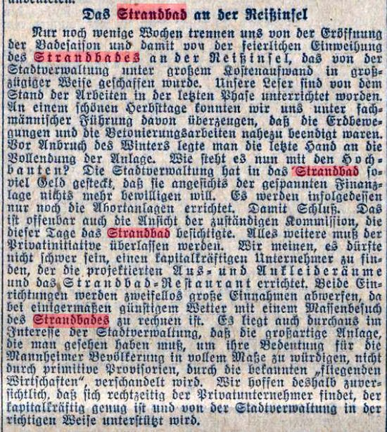 Die Pächter der beiden Strandbadrestaurants beschwerten sich gegenüber der Neuen Mannheimer Zeitung, dass in den Abendstunden nach Badeschluss das zahlungskräftige Publikum ferngehalten wird, weil kein Auto über den Damm hinaus vordringen durfte. Man regte dann an, Autobusse der damaligen OEG durchzulassen. Durch den Waldpark wurde dann ein gesonderter Fahrradweg als Notstandarbeit geschaffen.