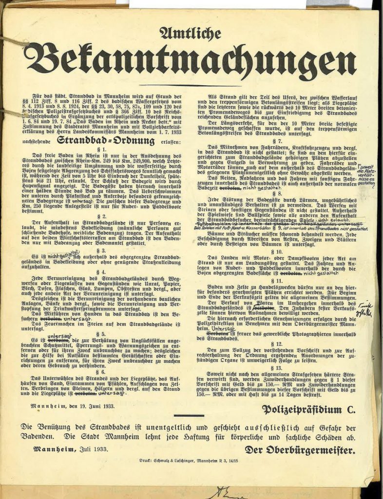 Oberbaudirektor Elsässer sprach damals auf der Strandpromenade über die Bedeutung des Mannheimer Strandbades für die Bevölkerung. Mit der Herstellung der Anlage 1927 habe man die Absicht verfolgt, der Bevölkerung einen kostenlosen Badestrand zur Verfügung zu stellen.